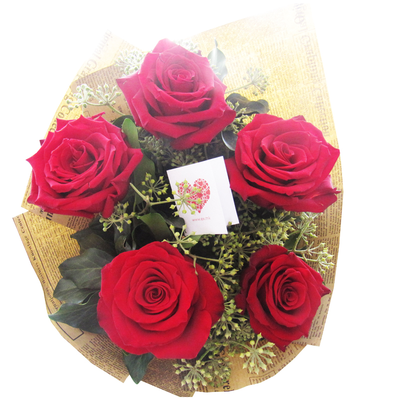 Раскошен цветен аранжман составен од 5 големи рози, дополнителнo декориран со зелени украсни гранки.