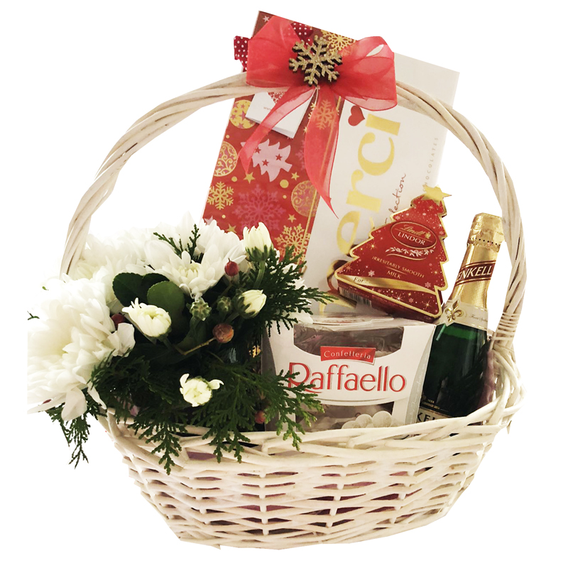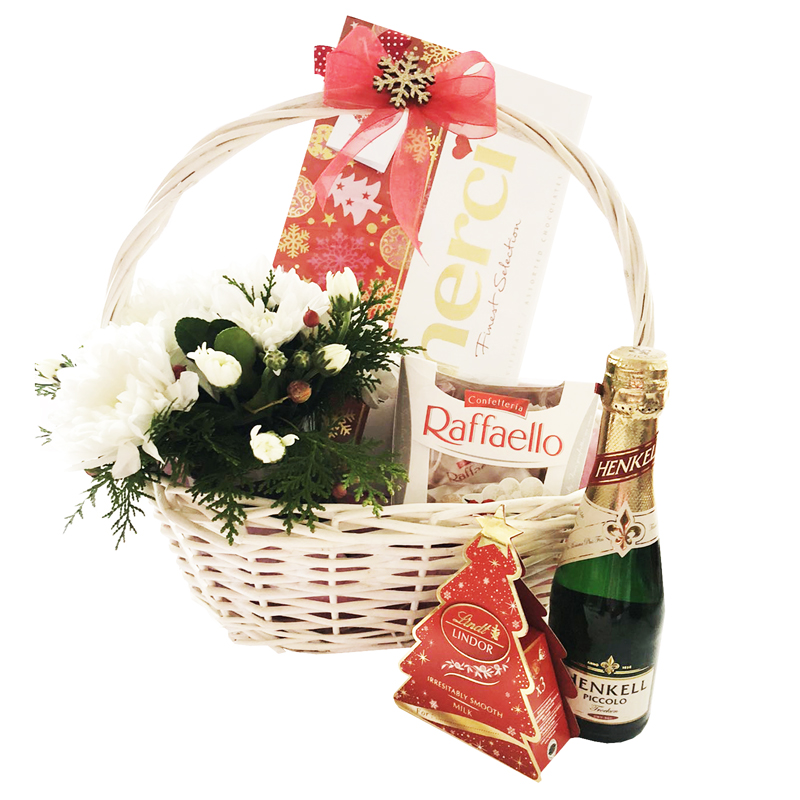 Корпата содржи голема Merci бонбониера, пенливо вино Хенкел, бонбониера Фереро Рафаело, мала бонбониера Линдор и цветен аранжман.