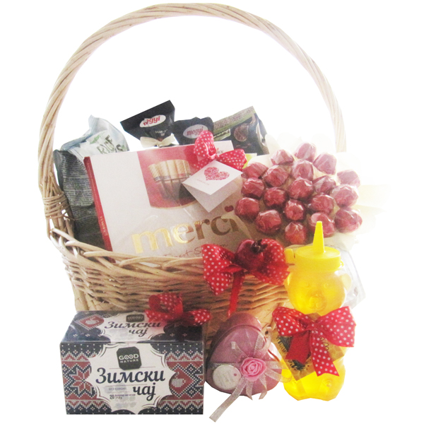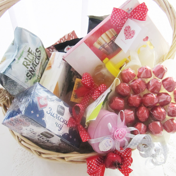 Голема корпа полна со апетисани, бонбониера, зимски чај, мед и букет гриоте.