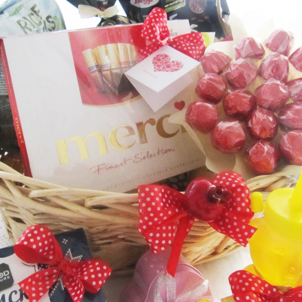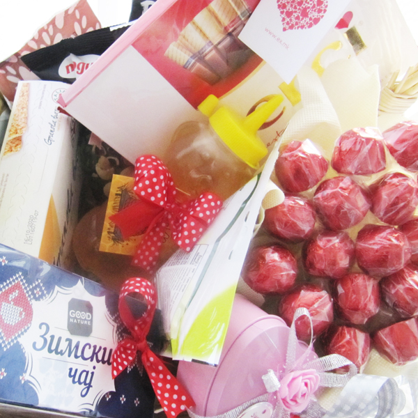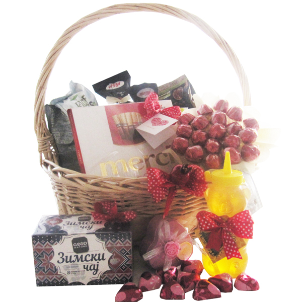 Опис Корпата содржи вино пакување суво грозје, две пакувања апетисани, оризови галети со различен вкус, пакување со гранола барс, зимски чај, мед во пакување мече, украсно пакување срце со пралини во форма на срце, бонбониера Merci и букет од гриоти.