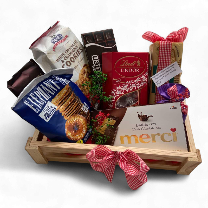 Аранжиран е во елегантна дрвена кутија и рачно декориран со празнични машнички и новогодишни детали, подготвен веднаш за подарување.