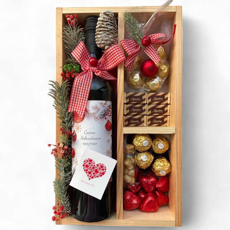 Секој елемент е украсно аранжиран со зимзелени гранчиња, борова шишарка, празнични црвени акценти и машнички, создавајќи топол и елегантен празничен изглед.
