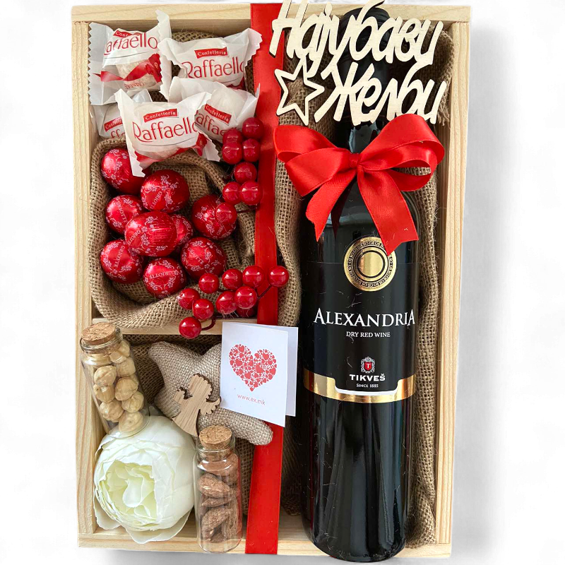 Опис Корпата содржи ТИКВЕШ АЛЕКСАНДРИЈА ЦРВЕНА 0.75Л, гриотте, Fererro Raffaello, апетисани и пригодни декорации.