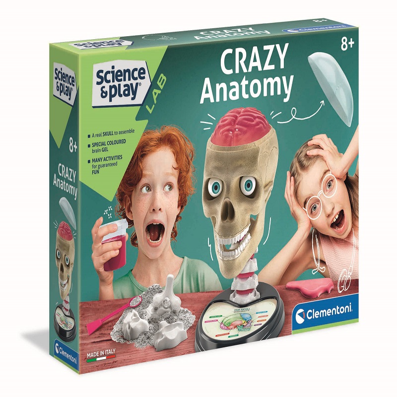 Со Anatomy надвор од својот ум, можете да дознаете! Соберете го човечкиот череп со сите негови делови и забавувајте се откривајќи неверојатни факти! Од гипсот до фазата на склопување: игра која го комбинира задоволството од градење на дел од човечкото тело со возбудата од допирање и разбирање како се направени нашите черепи. Игра која обработува научна тема на забавен и блескав начин, со трансформирање на сложеноста на анатомијата во стимулативно и забавно играчко искуство. Избраните материјали комбинираат реално чувство со сигурност. Сите супстанции вклучени во комплетот се проверени и сертифицирани за да се избегнат опасни реакции при контакт со кожата и очите. Череп што треба да се состави, две мозочни хемисфери, заби и очни топчиња, многу елементи што треба да се допрат и да се ракуваат како да се вистински органи, за ултрареалистичко искуство за играње. Следете ги авантурите на луд научник во привлечна приказна и дознајте многу научни факти благодарение на илустрираниот прирачник.