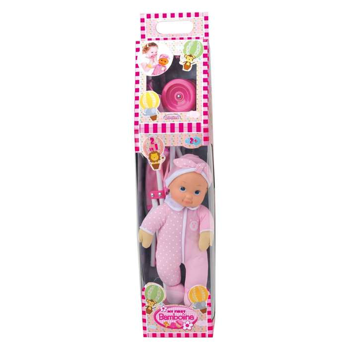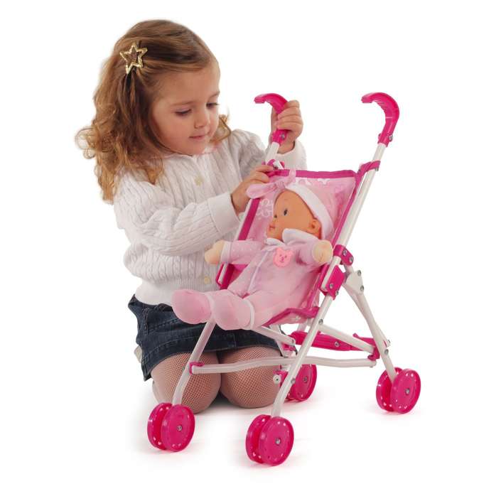 Овој преслаток сет вклучува бебе-кукла висока 34 cm и практична количка за прошетки – совршен избор за мали дечиња кои сакаат да играат улоги и да се грижат за својата бебешка кукла.
