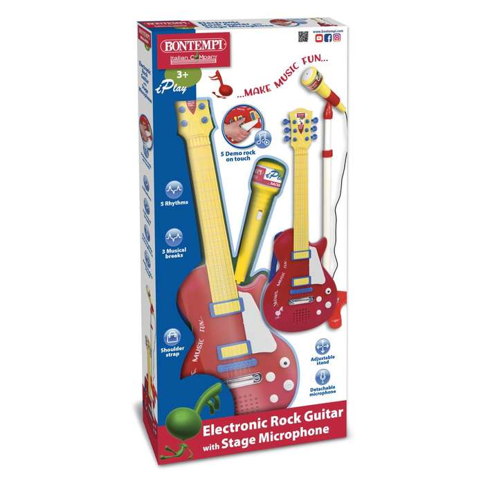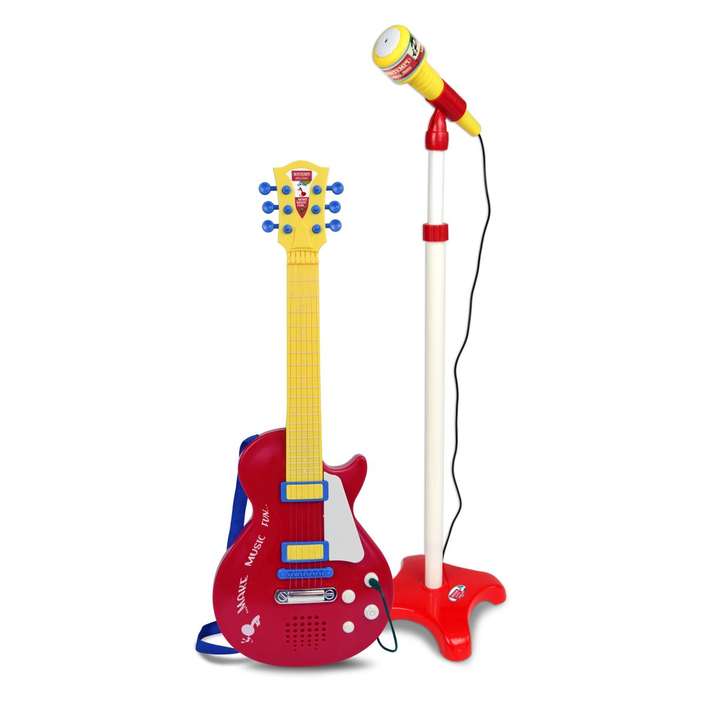 Гитарата има шест метални жици, пет демо песни, три музички паузи, пет ритми, автоматско исклучување и лента за на рамо. Можете исто така да пеете во микрофонот. Држачот за микрофон е прилагодлив во висина до 120 см.