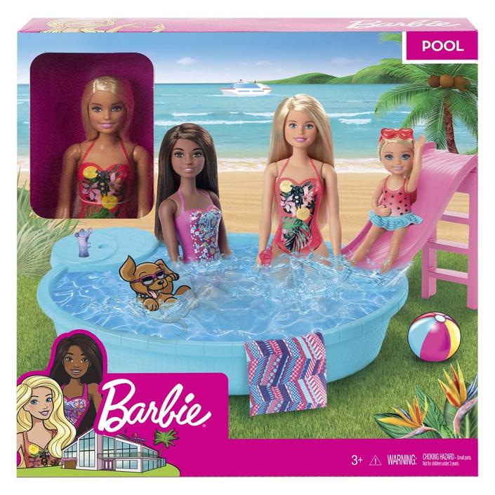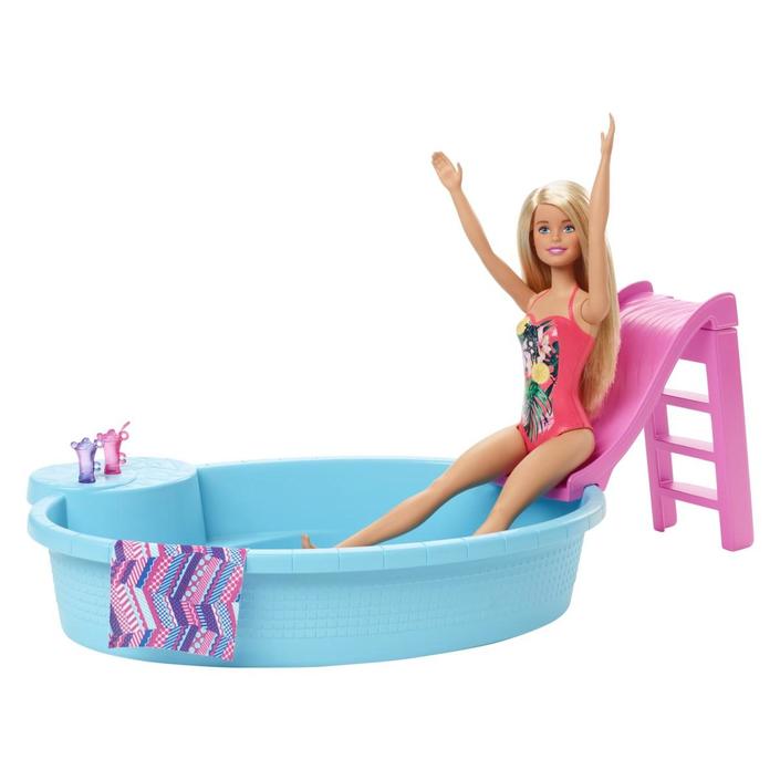 Куклата е облечена во шарен костим за капење, а сетот доаѓа со дополнителни аксесоари како чаши за пијалок и шарено пешкирче за уште пореална игра.